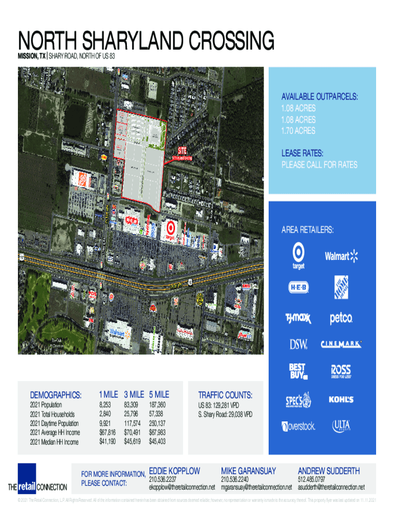 NORTH MARYLAND CROSSING MISSION, TX | SHARE ROAD, NORTH OF US 83AVAILABLE OUTPARCELS: 1.08 ACRES 1.08 ACRES 1.70 ACRES LEASE RATES: PLEASE CALL FOR RATEPAYER RETAILERS:DEMOGRAPHICS: 2021 Population