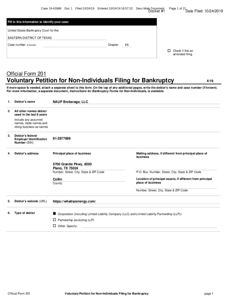 Case 1942888Doc 1Filed 10/24/19Entered 10/24/19 16:57:32Desc Main DocumentDocket #1Page 1 of 21Date Filed: 10/24/2019Fill in this information to identify your case: United States Bankruptcy Court