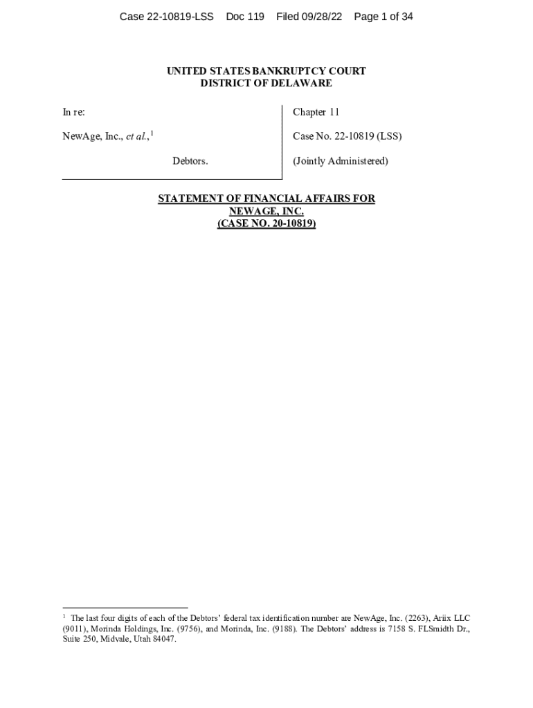 Case 2210819LSSDoc 119Filed 09/28/22Page 1 of 34UNITED STATES BANKRUPTCY COURT DISTRICT OF DELAWARE In re:Chapter 11NewAge, Inc., et al., 1Case No. 2210819 (LESS) Debtors.(Jointly Administered)STATEMENT