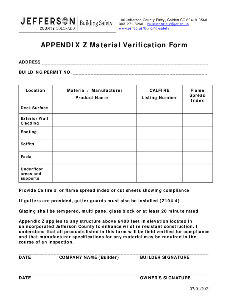 100 Jefferson County Pkwy, Golden CO 804193540 3032718260 buildingsafety@jeffco.us www.jeffco.us/buildingsafetyAPPENDIX Z Material Verification Form ADDRESS ___ BUILDING PERMIT NO. ___LocationMaterial