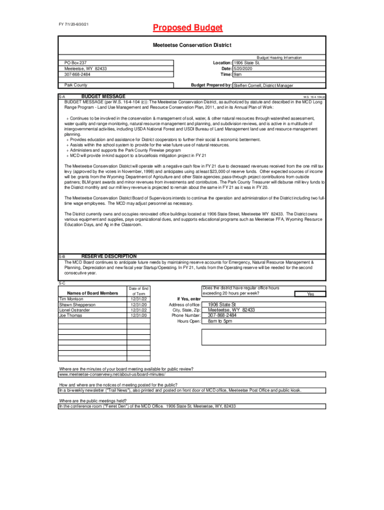 FY 7/1/206/30/21Proposed Budget Mentees Conservation District Budget Hearing Information PO Box 237 Mentees, WY 82433 3078682484Location: 1906 State St. Date: 5/20/2020 Time: 9amPark County Budget