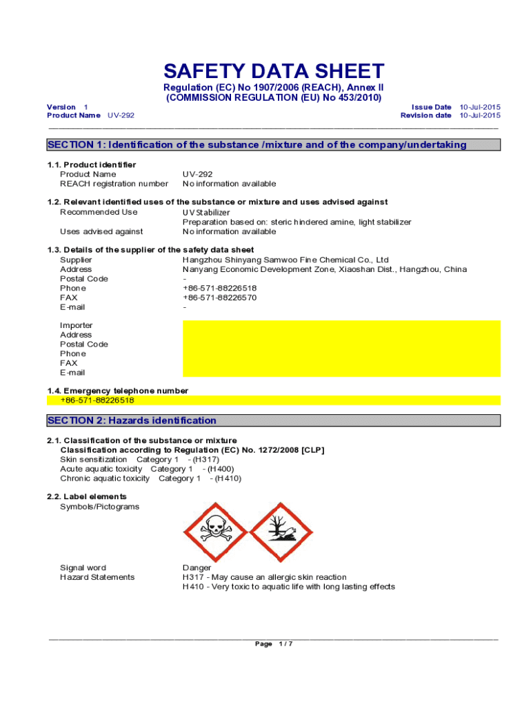 SAFETY DATA SHEET Regulation (EC) No 1907/2006 (REACH), Annex II (COMMISSION REGULATION (EU) No 453/2010) Version 1 Product Namesake Date 10Jul2015 Revision date 10Jul2015UV292___SECTION 1: Identification