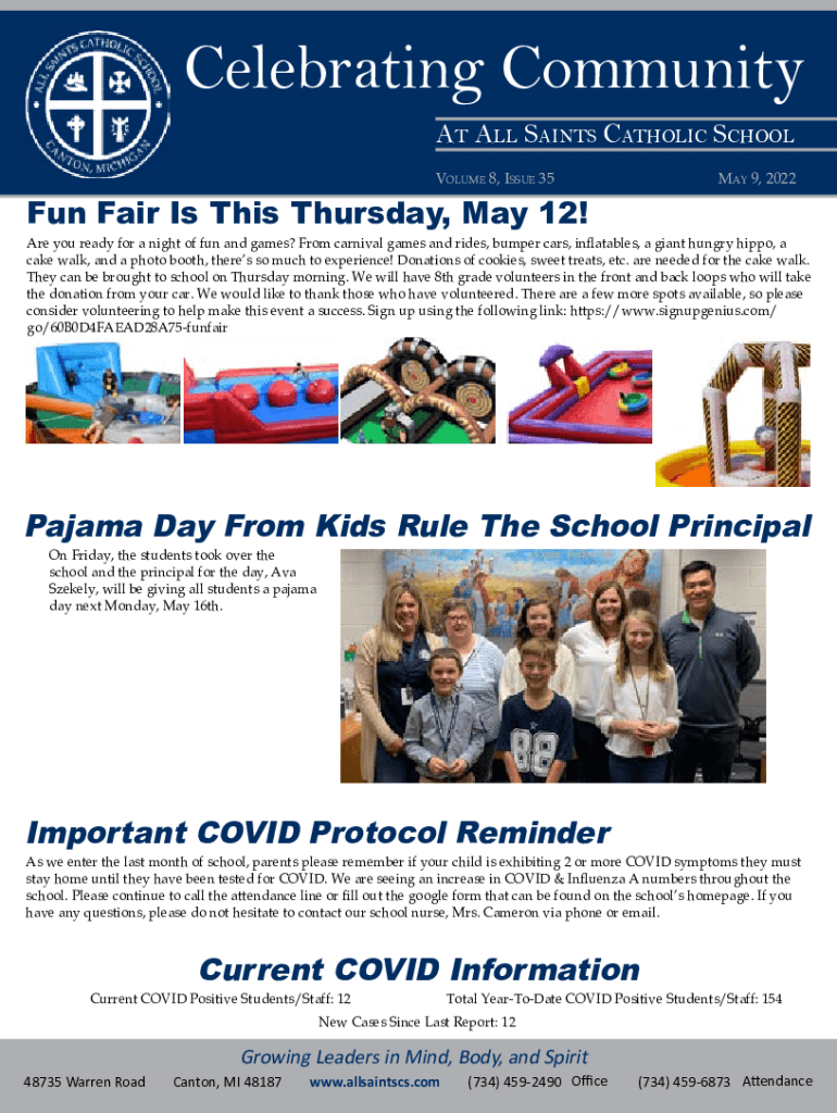 Celebrating Community At All Saints Catholic School May 9, 2022Volume 8, Issue 35Fun Fair Is This Thursday, May 12! Are you ready for a night of fun and games? From carnival games and rides, bumper