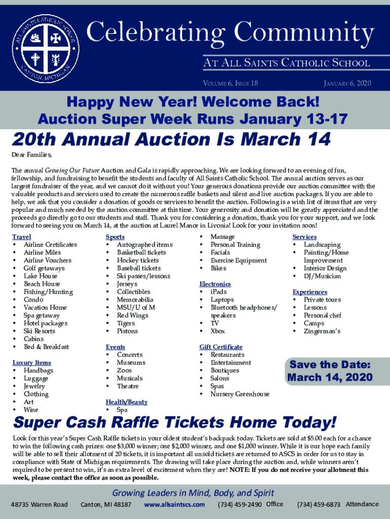 Celebrating Community At All Saints Catholic School Volume 6, Issue 18January 6, 2020Happy New Year! Welcome Back! Auction Super Week Runs January 131720th Annual Auction Is March 14Dear Families,