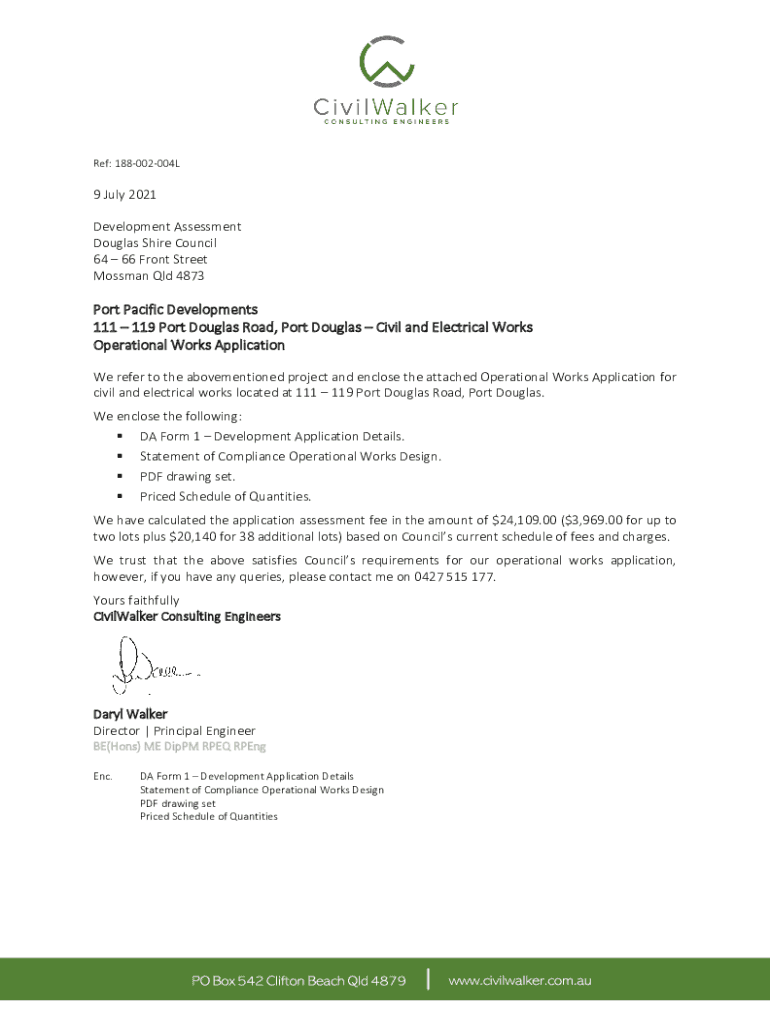 Ref: 188002004L9 July 2021 Development Assessment Douglas Shire Council 64 66 Front Street Moss man QLD 4873Port Pacific Developments 111 119 Port Douglas Road, Port Douglas Civil and Electrical Works