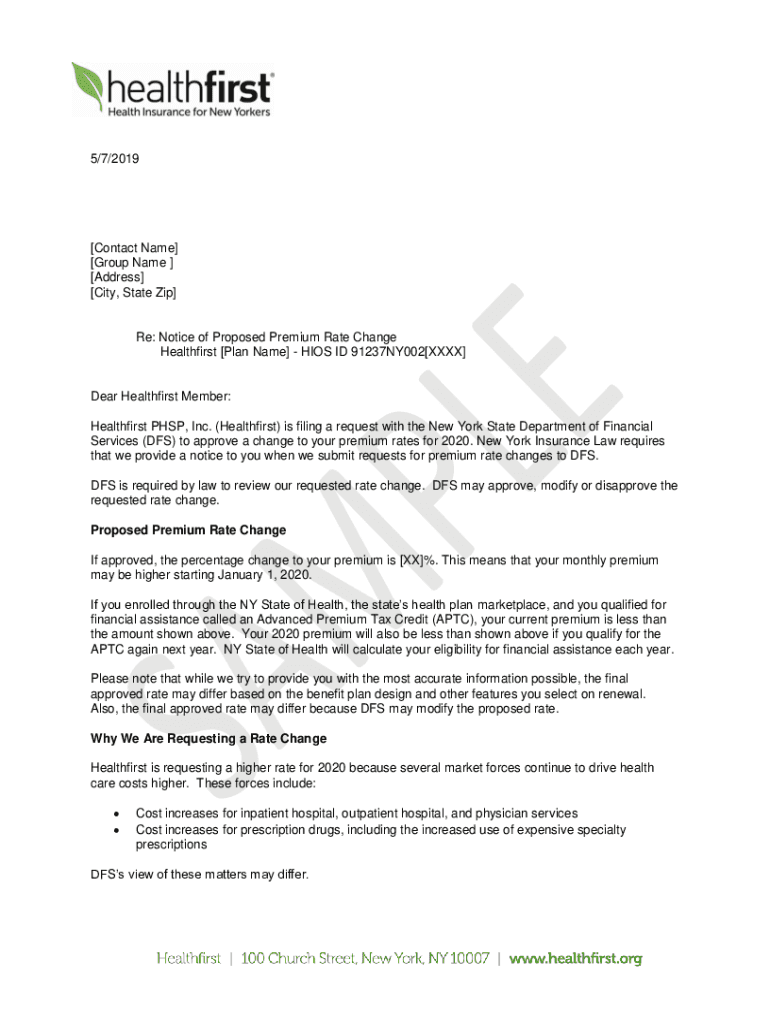 5/7/2019[Contact Name] [Group Name] [Address] [City, State Zip’Re: Notice of Proposed Premium Rate Change Health first [Plan Name] HIS ID 91237NY002[XXX]Dear Health first Member: Health first PSP,