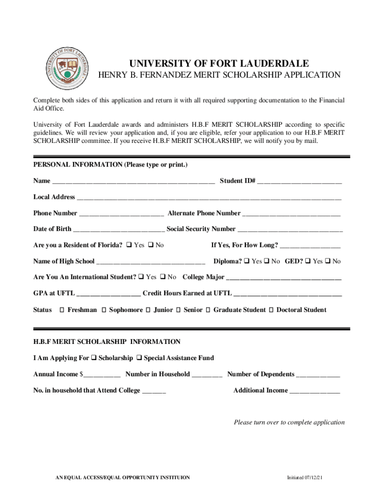 Upon completion, please submit this form via email to: financialaid@uftl.edu.UNIVERSITY OF FORT LAUDERDALE GUIDELINES FOR HENRY B. FERNANDEZ MERIT SCHOLARSHIP CONTACT The Financial Aid Office oversees