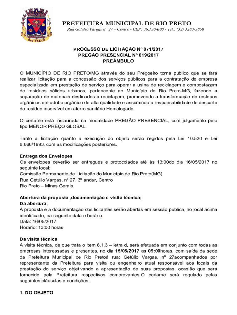 RUA Gelid Vargas n 27 CENTR CEP: 36.130000 Tel.: (32) 32833850PROCESSO DE LICIT AO N 071/2017
