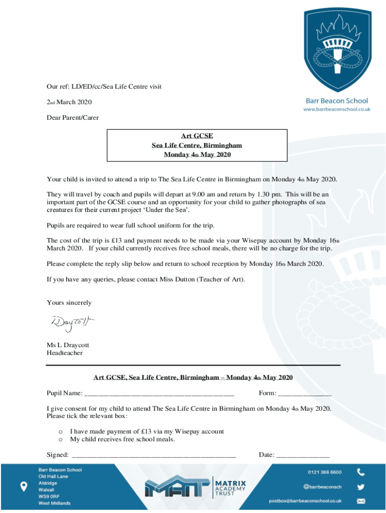 Our ref: LD/ED/cc/Sea Life Center visit 2nd March 2020 Dear Parent/Carer Art GCSE Sea Life Center, Birmingham Monday 4th May 2020Your child is invited to attend a trip to The Sea Life Center in Birmingham