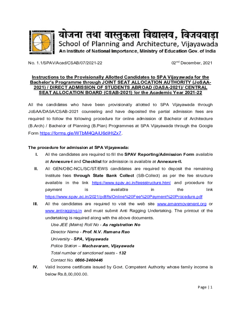 02nd December, 2021No. 1.1/SPAN/Acid/CAB/07/202122Instructions to the Provisionally Allotted Candidates to SPA Vijayawada for the Bachelors Program through JOINT SEAT ALLOCATION AUTHORITY (JoSAA2021)