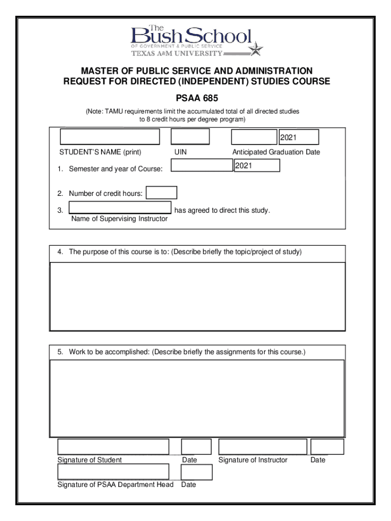 MASTER OF PUBLIC SERVICE AND ADMINISTRATION REQUEST FOR DIRECTED (INDEPENDENT) STUDIES COURSE PSA 685 (Note: TAME requirements limit the accumulated total of all directed studies to 8 credit hours