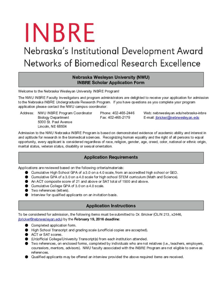 Nebraska Wesleyan University (NU) INBRED Scholar Application Form WelcometotheNebraskaWesleyanUniversityINBREProgram! TheNWUINBREFacultyInvestigatorsandprogramadministratorsaredelightedtoreceiveyourapplicationforadmission
