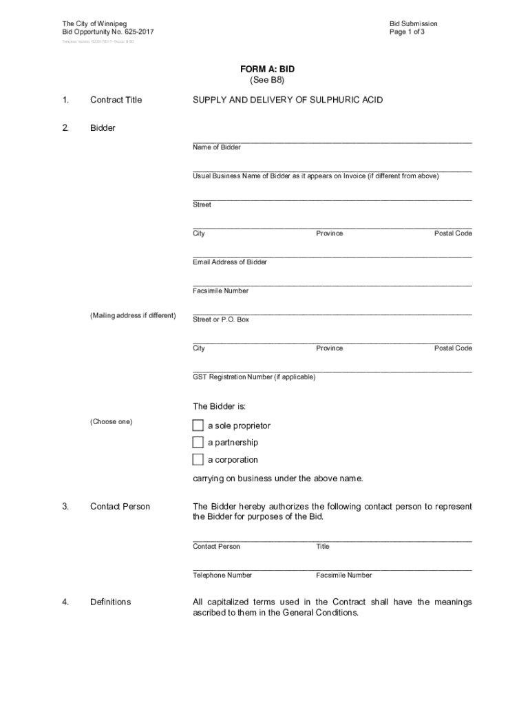 The City of Winnipeg Bid Opportunity No. 6252017Bid Submission Page 1 of 3Template Version: G220170317 Goods B ISOFORM A: BID (See B8) 1. Contract Title2. Undersupply AND DELIVERY OF SULFURIC ACID___