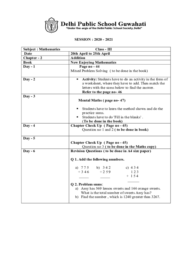 SESSION : 2020 2021 Subject : Mathematics Date Chapter 2 Book Day 1 Day 2Class III 20th April to 25th April Addition New Enjoying Mathematics Page no 44 Mixed Problem-Solving (to be done in the book)