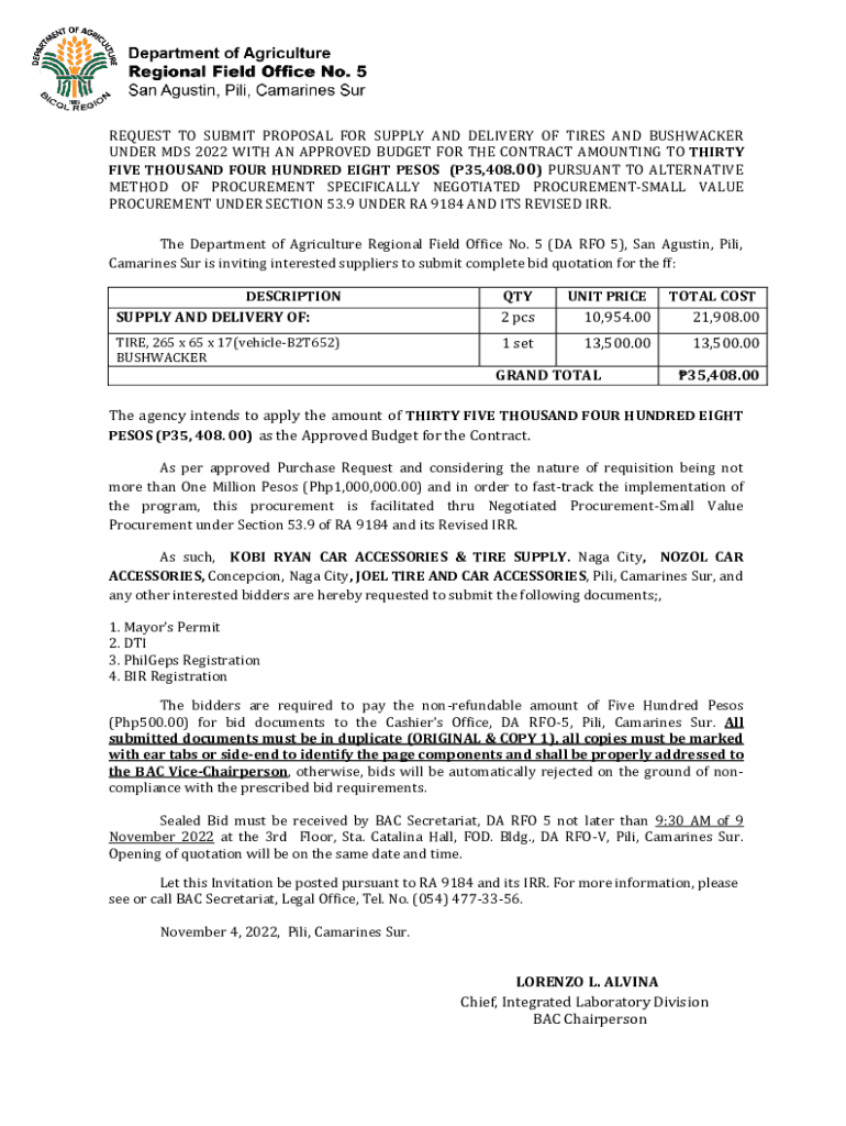 REQUEST TO SUBMIT PROPOSAL FOR SUPPLY AND DELIVERY OF TIRES AND BUSHWHACKER UNDER MDS 2022 WITH AN APPROVED BUDGET FOR THE CONTRACT AMOUNTING TO THIRTY FIVE THOUSAND FOUR HUNDRED EIGHT PESOS (P35,408.00)