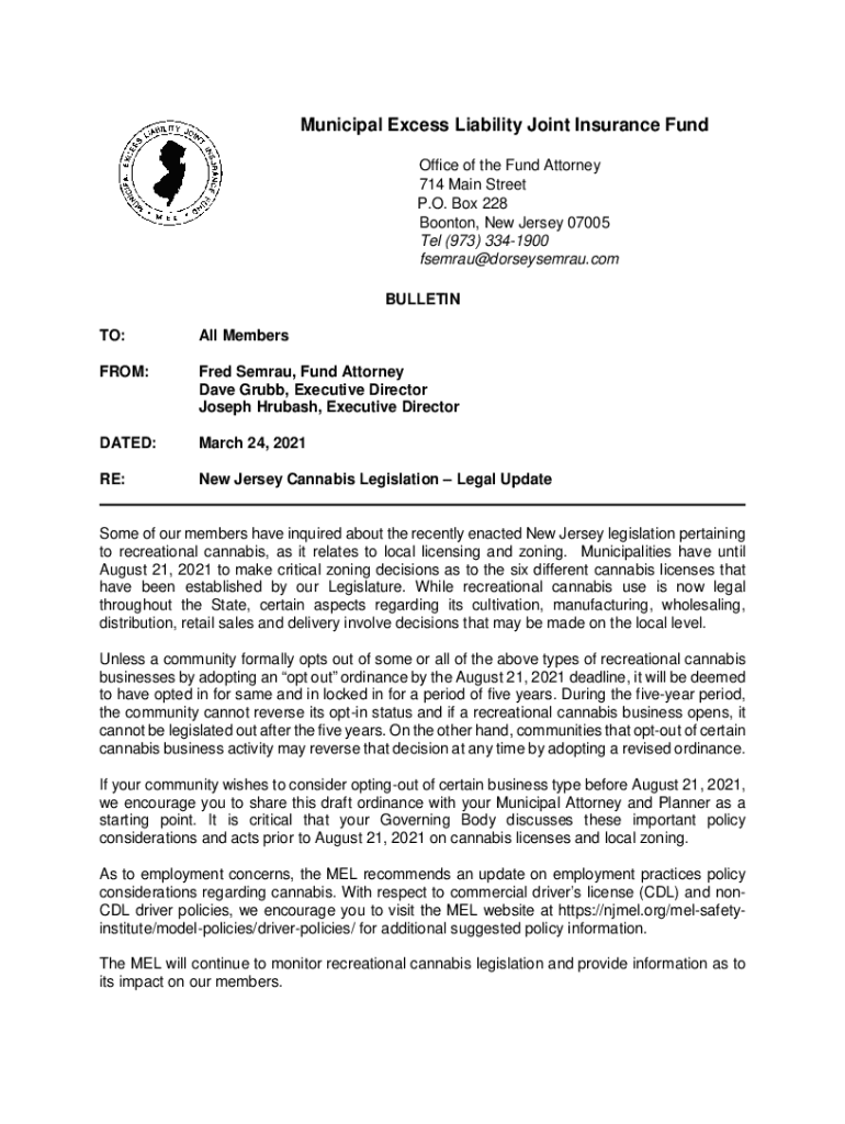 Municipal Excess Liability Joint Insurance Fund Office of the Fund Attorney 714 Main Street P.O. Box 228 Boon ton, New Jersey 07005 Tel (973) 3341900 fsemrau@dorseysemrau.com BULLETIN TO:All MembersFROM:Fred