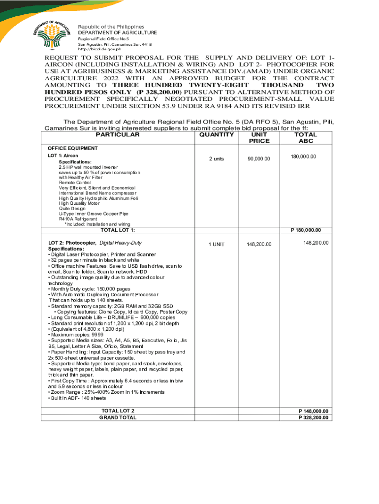 REQUEST TO SUBMIT PROPOSAL FOR THE SUPPLY AND DELIVERY OF: LOT 1AIRCON (INCLUDING INSTALLATION & WIRING) AND LOT 2 PHOTOCOPIER FOR USE AT AGRIBUSINESS & MARKETING ASSISTANCE DIV.(AHMAD) UNDER ORGANIC