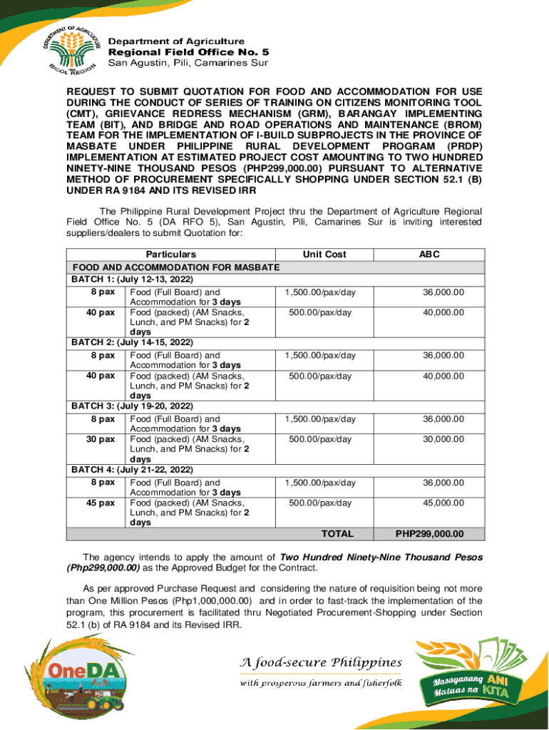 REQUEST TO SUBMIT QUOTATION FOR FOOD AND ACCOMMODATION FOR USE DURING THE CONDUCT OF SERIES OF TRAINING ON CITIZENS MONITORING TOOL (CMT), GRIEVANCE REDRESS MECHANISM (ARM), BARANGAY IMPLEMENTING