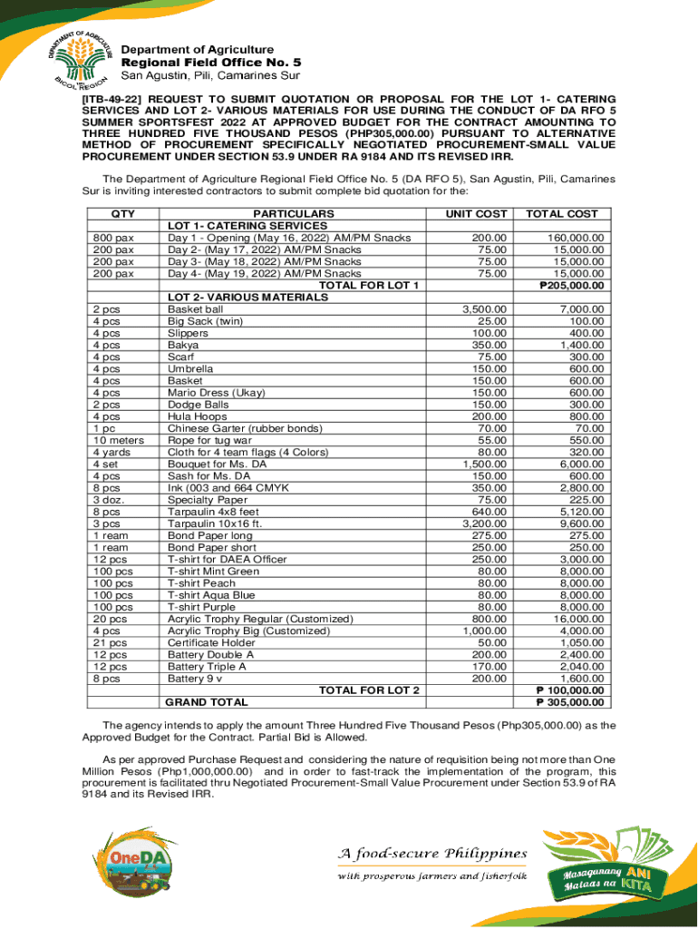 [ITB4922] REQUEST TO SUBMIT QUOTATION OR PROPOSAL FOR THE LOT 1 CATERING SERVICES AND LOT 2 VARIOUS MATERIALS FOR USE DURING THE CONDUCT OF DA RIO 5 SUMMER SPORTIEST 2022 AT APPROVED BUDGET FOR THE
