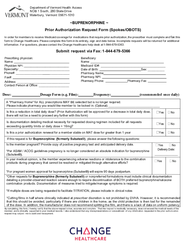 Department of Vermont Health Access NOB 1 South, 280 State Drive Waterbury, Vermont 056711010BUPRENORPHINE Prior Authorization Request Form (Spokes/ROBOTS) In order for members to receive Medicaid