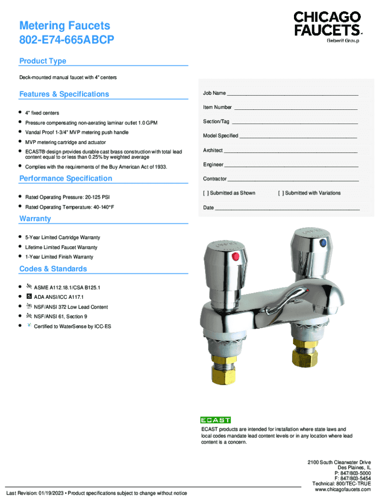 Metering Faucets 802E74665ABCP Product Type Deck mounted manual faucet with 4\” centersFeatures & Specifications Job Name ___ Item Number ___4\” fixed centers Pressure compensating nonaerating