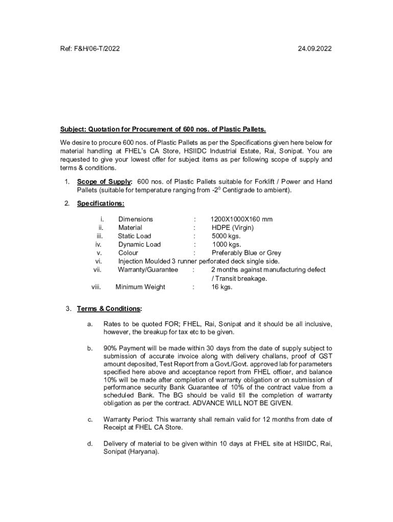 Ref: F&H/06T/202224.09.2022Subject: Quotation for Procurement of 600 nos. Of Plastic Pallets. We desire to procure 600 nos. Of Plastic Pallets as per the Specifications given here below for material