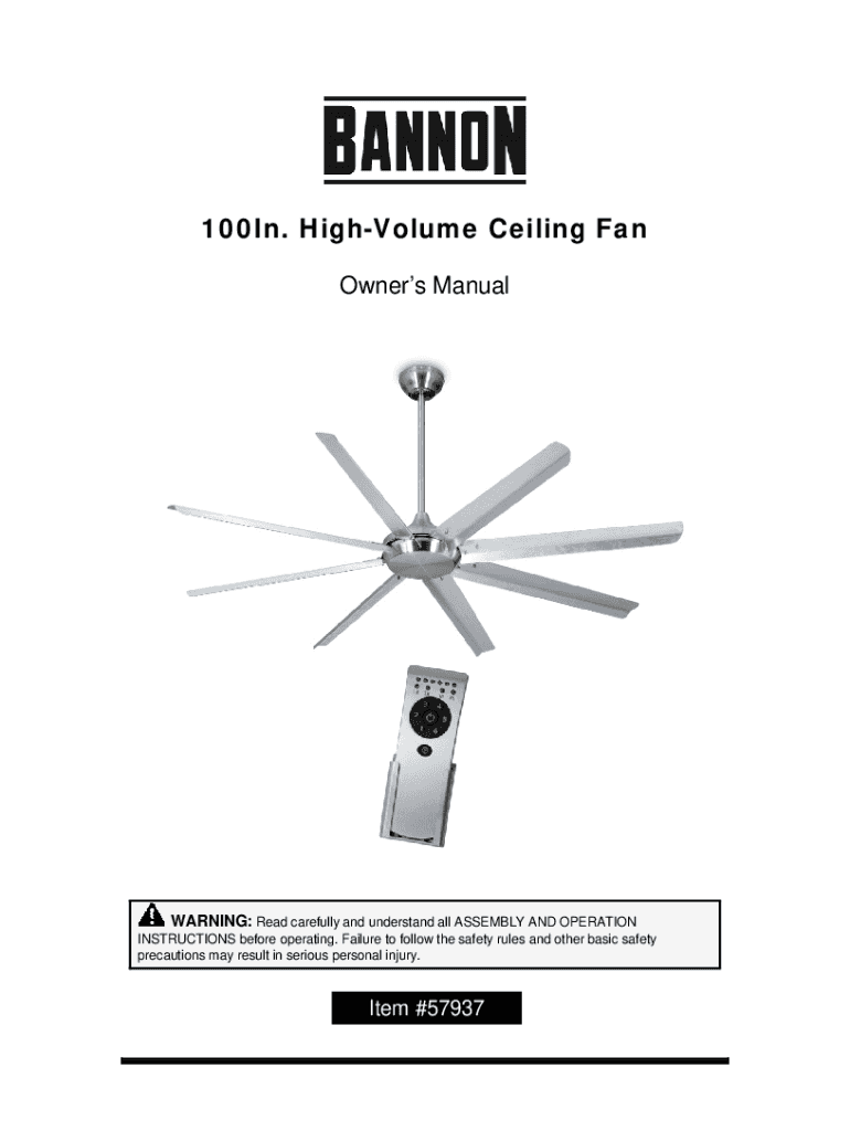 100In. HighVolume Ceiling Fan Owners ManualWARNING: Read carefully and understand all ASSEMBLY AND OPERATION INSTRUCTIONS before operating. Failure to follow the safety rules and other basic safety