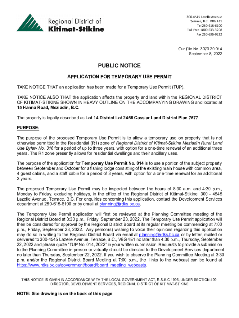 3004545 Gazelle Avenue Terrace, B.C. V8G 4E1 Tel 2506156100 Toll Free 18006333208 Fax 2506359222Our File No. 3070 20 014 September 8, 2022PUBLIC NOTICE APPLICATION FOR TEMPORARY USE PERMIT TAKE NOTICE