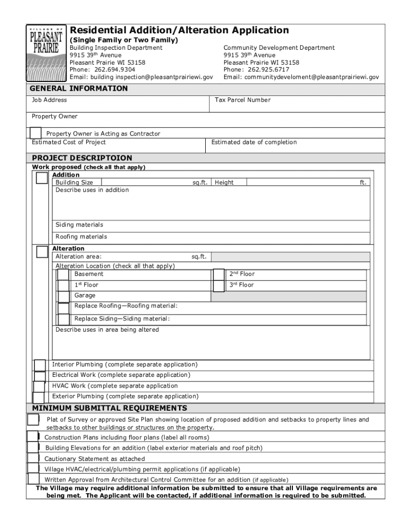 Residential Addition/Alteration Application (Single Family or Two Family) Building Inspection Department 9915 39th Avenue Pleasant Prairie WI 53158 Phone: 262.694.9304 Email: building inspection@pleasantprairiewi.govCommunity