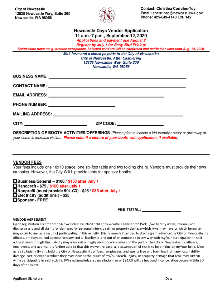 Contact: Christina CorralesToy Email: christinac@newcastlewa.gov Phone: 4256494143 Ext. 142City of Newcastle 12835 Newcastle Way, Suite 200 Newcastle, WA 98056Newcastle Days Vendor Application 11