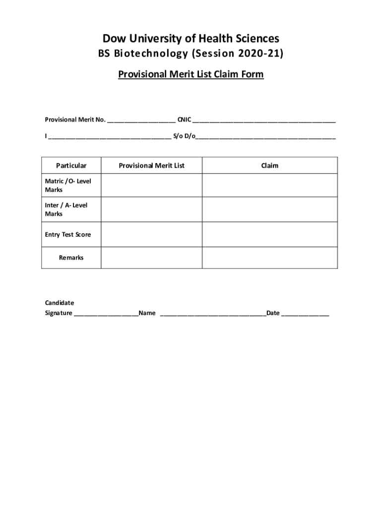 Dow University of Health Sciences BS Biotechnology (Session 202021) Provisional Merit List Claim FormProvisional Merit No. ___ CNIC ___ I ___ S/o D/o___ParticularProvisional Merit ListClaimMatric