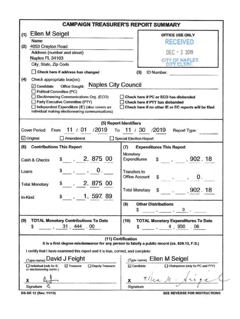 CAMPAIGN TREASURER\'S REPORT SUMMARY(1) Ellen M SeigelOFFICE USE ONLYNameRECEIVED(2) 4053 Clayton Road