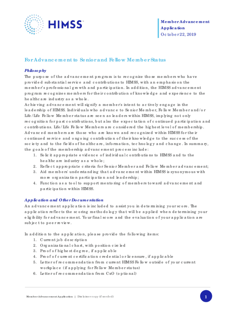 Member Advancement Application October 22, 2019For Advancement to Senior and Fellow Member Status Philosophy The purpose of the advancement program is to recognize those members who have provided