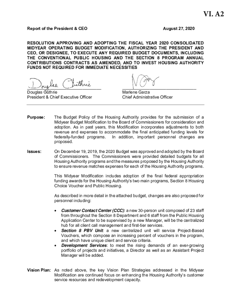 VI. A2 Report of the President & CEO August 27, 2020RESOLUTION APPROVING AND ADOPTING THE FISCAL YEAR 2020 CONSOLIDATED MIDYEAR OPERATING BUDGET MODIFICATION, AUTHORIZING THE PRESIDENT AND CEO, OR