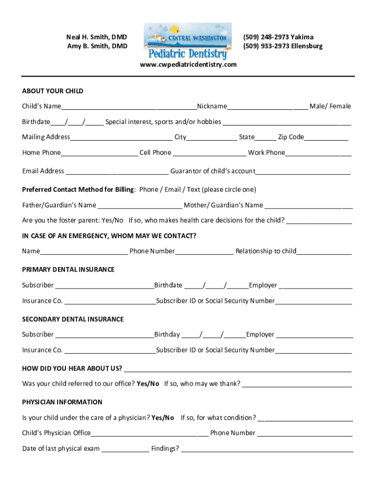 Neal H. Smith, DMD Amy B. Smith, DMD(509) 2482973 Yakima(509) 9332973 Ellensburg.cwpediatricdentistry.com ABOUT YOUR CHILD's Name___Nickname___ Male/ Female Birthdate___/___/___ Special interest,