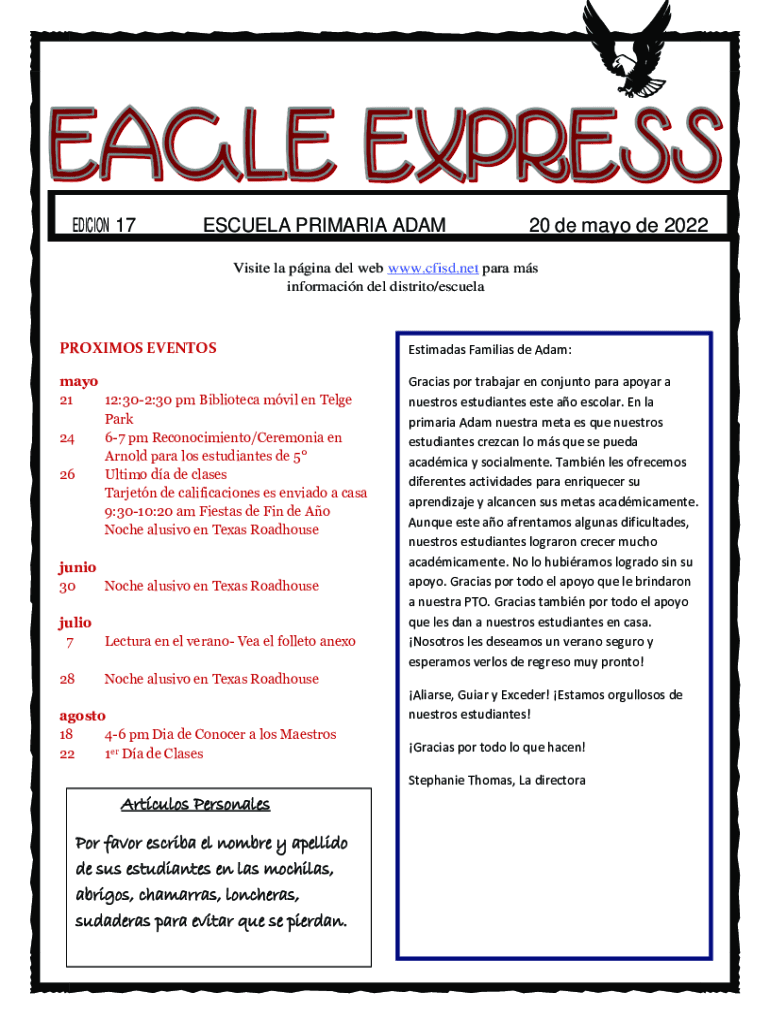 EDITION 17ESCUELA PRIM ARIA ADAM20 de mayo de 2022Visite la Gina Del web www.cfisd.net para ms