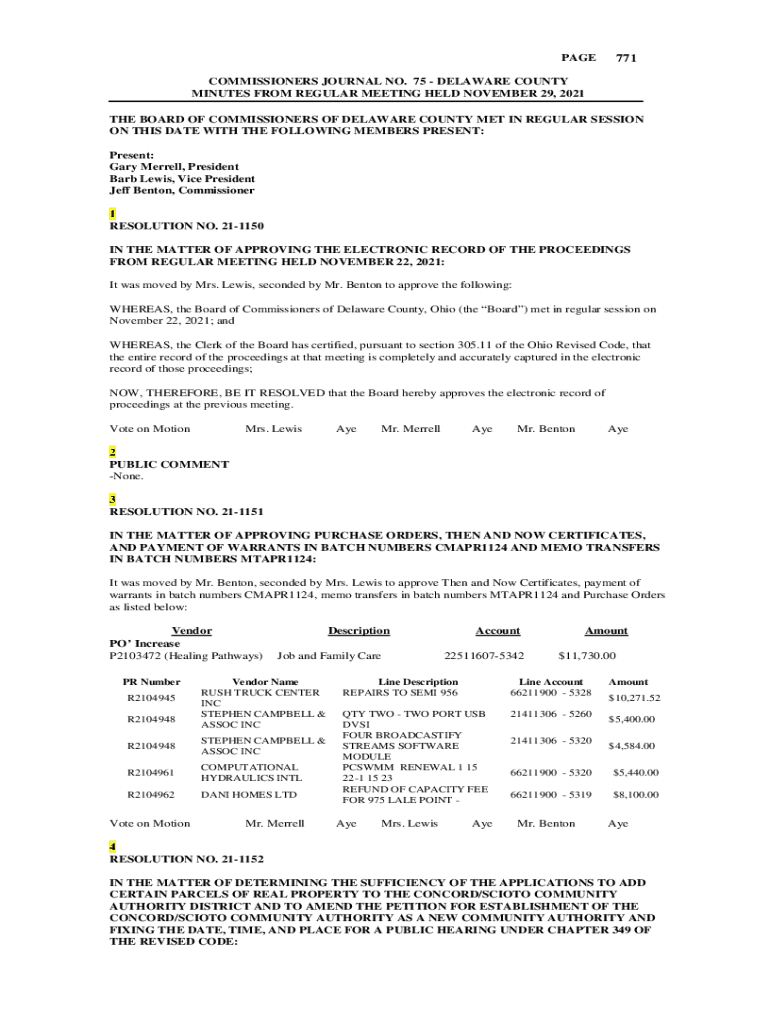 PAGE771COMMISSIONERS JOURNAL NO. 75 DELAWARE COUNTY MINUTES FROM REGULAR MEETING HELD NOVEMBER 29, 2021, THE BOARD OF COMMISSIONERS OF DELAWARE COUNTY MET IN REGULAR SESSION ON THIS DATE WITH THE
