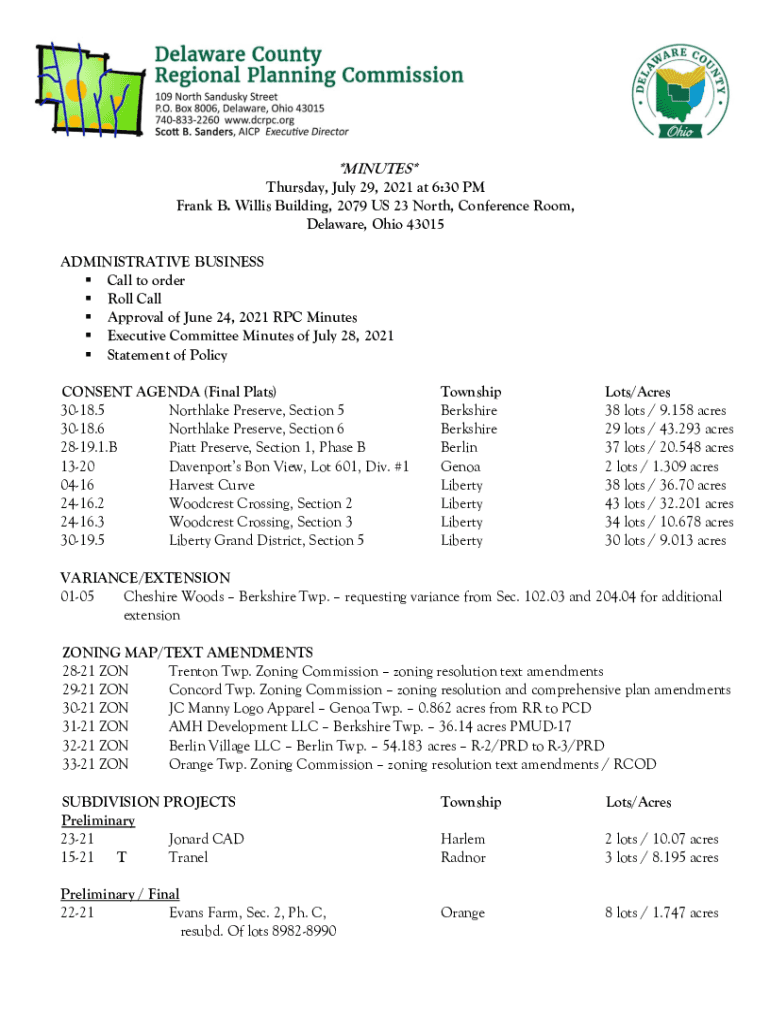 *MINUTES* Thursday, July 29, 2021, at 6:30 PM Frank B. Willis Building, 2079 US 23 North, Conference Room, Delaware, Ohio 43015 ADMINISTRATIVE BUSINESS Call to order Roll Call Approval of June 24,