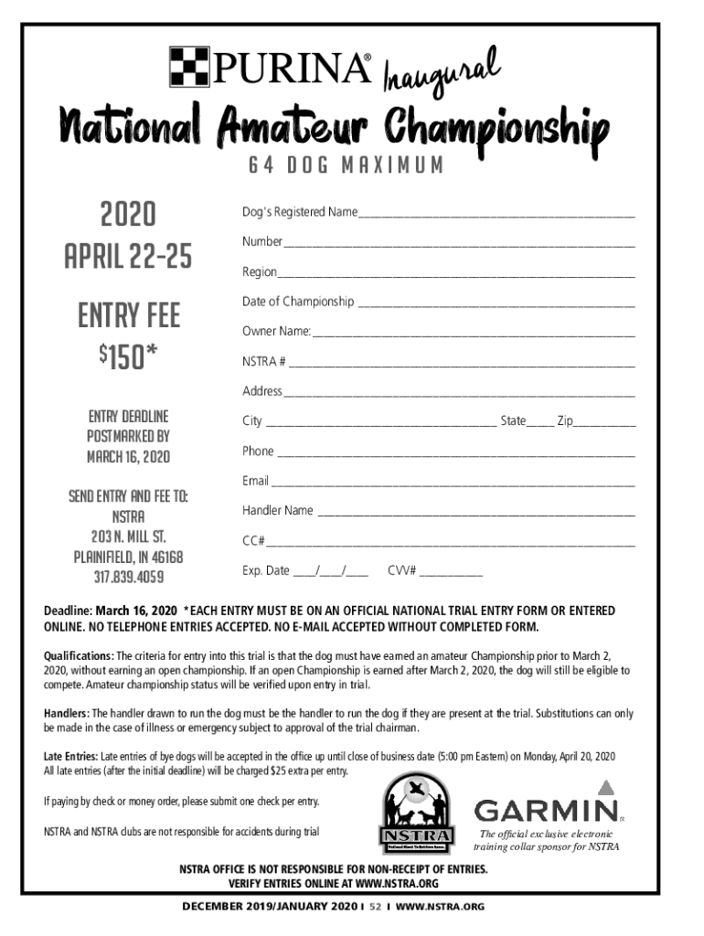 NI auguralNational Amateur Championship 64 Dog Maximum2020 April 2225Dog\'s Registered Name___ Number___ Region___ Date of Championship___Entry Fee $150×Owner Name:___ EXTRA #___ Address___Entry