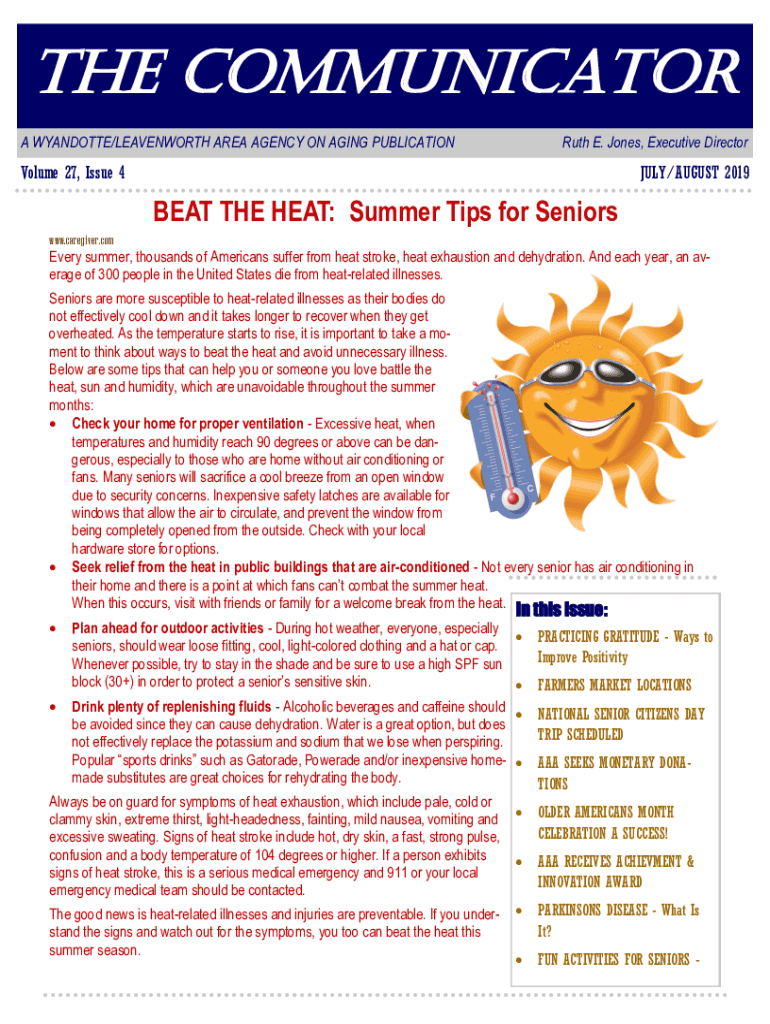THE COMMUNICATOR A WYANDOTTE/LEAVENWORTH AREA AGENCY ON AGING PUBLICATION Ruth E. Jones, Executive DirectorVolume 27, Issue 4JULY/AUGUST 2019BEAT THE HEAT: Summer Tips for Seniors www.caregiver.comEvery