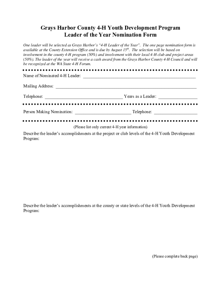 Grays Harbor County 4H Youth Development Program Leader of the Year Nomination Form One leader will be selected as Grays Harbors 4H Leader of the Year. The one-page nomination form is available at