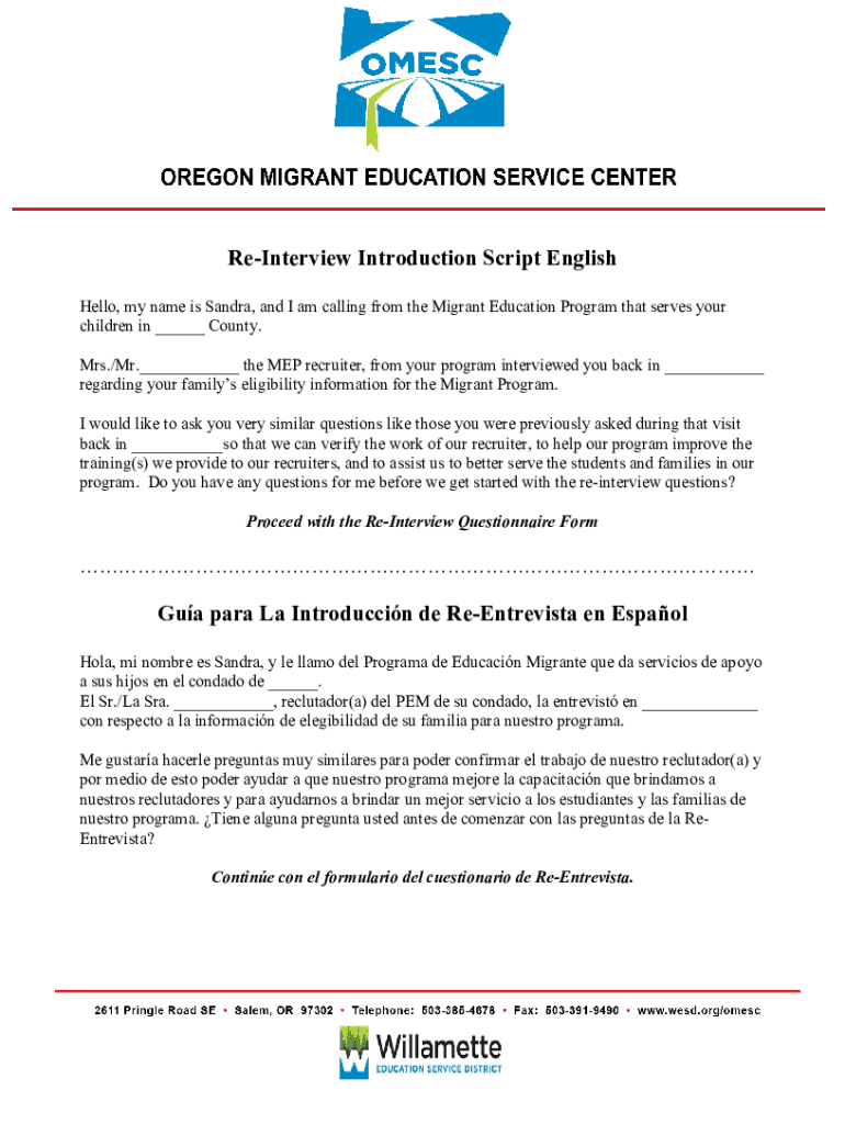 Interview Introduction Script English Hello, my name is Sandra, and I am calling from the Migrant Education Program that serves your children in ___ County. Mrs./Mr.___ the MEP recruiter, from your
