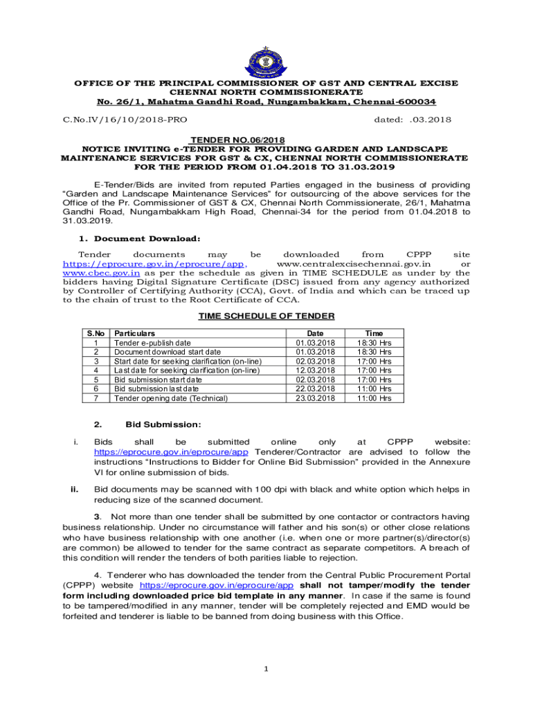 OFFICE OF THE PRINCIPAL COMMISSIONER OF GST AND CENTRAL EXCISE CHENNAI NORTH COMMISSIONER ATE No. 26/1, Mahatma Gandhi Road, Nungambakkam, Chennai600034 C. No.IV/16/10/2018PROdated: .03.2018TENDER
