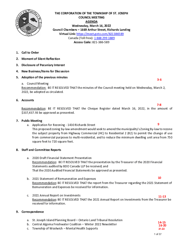THE CORPORATION OF THE TOWNSHIP OF ST. JOSEPH COUNCIL MEETING AGENDA Wednesday, March 16, 2022, Council Chambers 1669 Arthur Street, Richards Landing Virtual Link: https://meet.goto.com/821386589