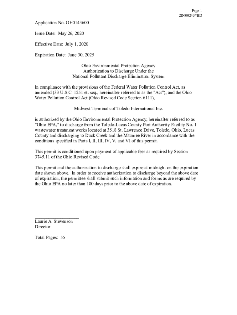 Page 1 2IN00243×Application No. OH0143600 Issue Date: May 26, 2020, Effective Date: July 1, 2020, Expiration Date: June 30, 2025 Ohio Environmental Protection Agency Authorization to Discharge Under