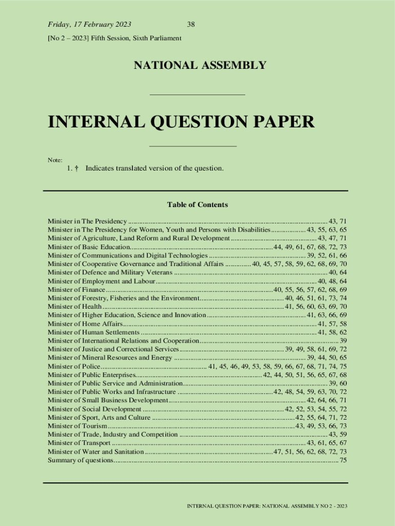 Friday, 17 February 202338[No 2 2023] Fifth Session, Sixth ParliamentNATIONAL ASSEMBLY ___INTERNAL QUESTION PAPER ___ Note:1. Indicates translated version of the question. Table of Contents Minister