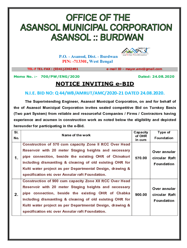 P.O. Asansol, Dist. Burden PIN: 713301, West Bengal SELF TEL FAX : (0341)2302491Memo No. email ID mayor.amc@gmail.com700/PW/ENG/2020Dated: 24.08.2020NOTICE INVITING bid N.I.E. BID NO: Q 44/WB/AMR