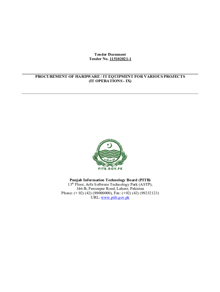Tender Document Tender No. 1151020211PROCUREMENT OF HARDWARE / IT EQUIPMENT FOR VARIOUS PROJECTS (IT OPERATIONS IX)Punjab Information Technology Board (PIT) 13th Floor, Area Software Technology Park