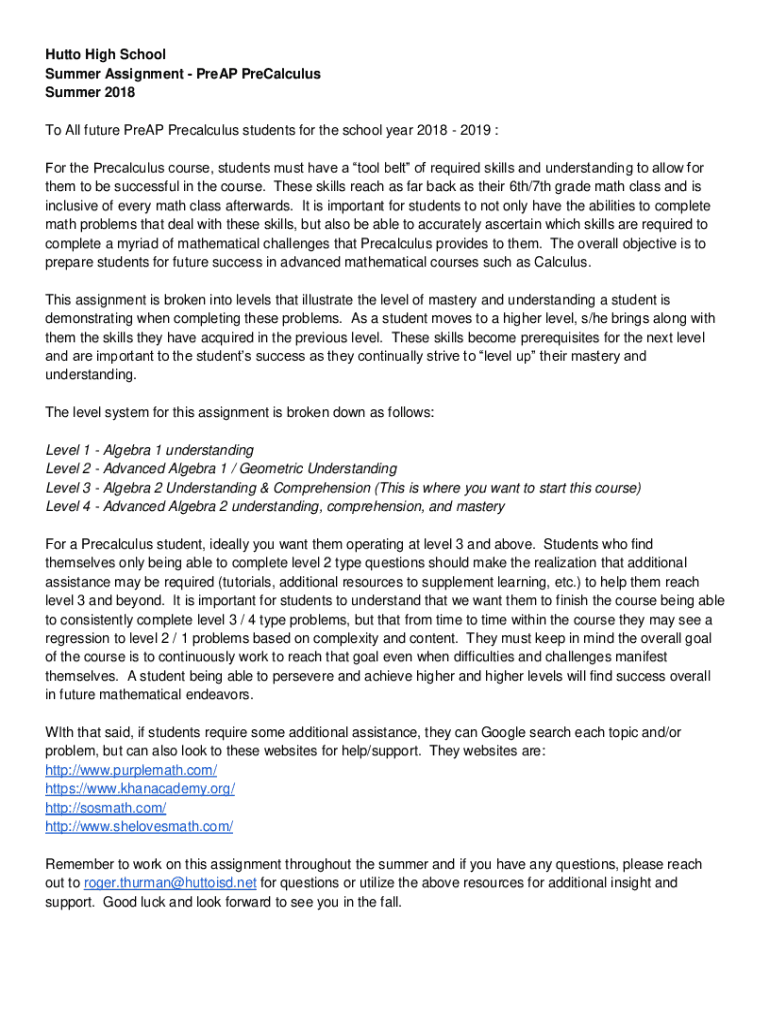 Bhutto High School Summer Assignment Prep PreCalculus Summer 2018 To All future Prep Precalculus students for the school year 2018 2019 : For the Precalculus course, students must have a tool belt