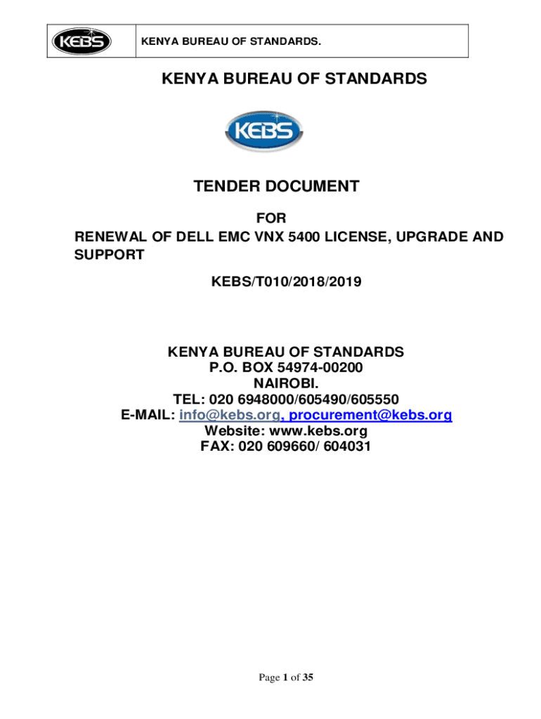 KENYA BUREAU OF STANDARDS.KENYA BUREAU OF STANDARDSTENDER DOCUMENT FOR RENEWAL OF DELL EMC VAX 5400 LICENSE, UPGRADE AND SUPPORT KEYS/T010/2018/2019KENYA BUREAU OF STANDARDS P.O. BOX 5497400200 NAIROBI.